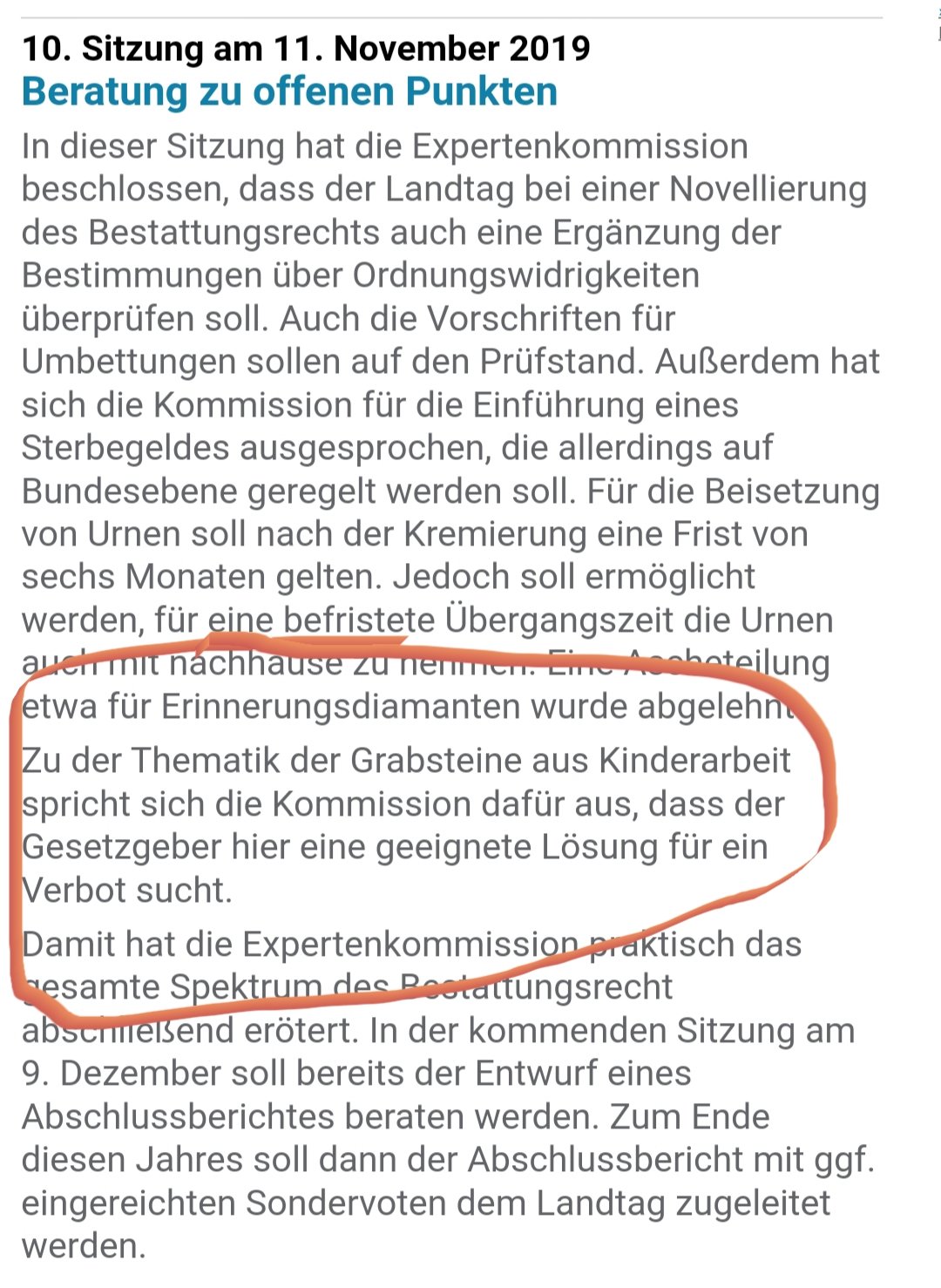 Wir stellten im Herbst des Jahres einen Antrag an die Stadtvertretung, dass Schwerin das Land Mecklenburg Vorpommern auffordern solle, zukünftig Sorge um die Herkunft der Grabsteine zu tragen und sicher gestellt werden soll, dass Grabsteine nicht aus Ländern stammen, die Kinder in Steinbrüchen arbeiten lassen.
