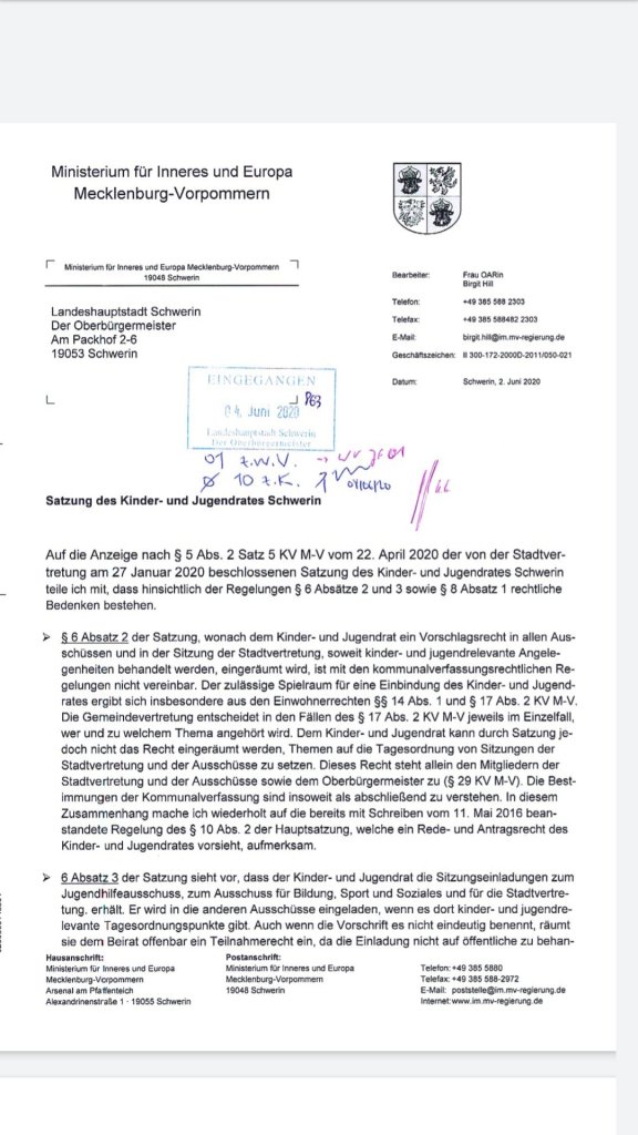 Dieses Sonderrecht musste die Landeshauptstadt Schwerin dem KiJuRa entziehen, da das Innenministerium der Ansicht war, dass dies mit der Kommulverfassung nicht vereinbar ist.