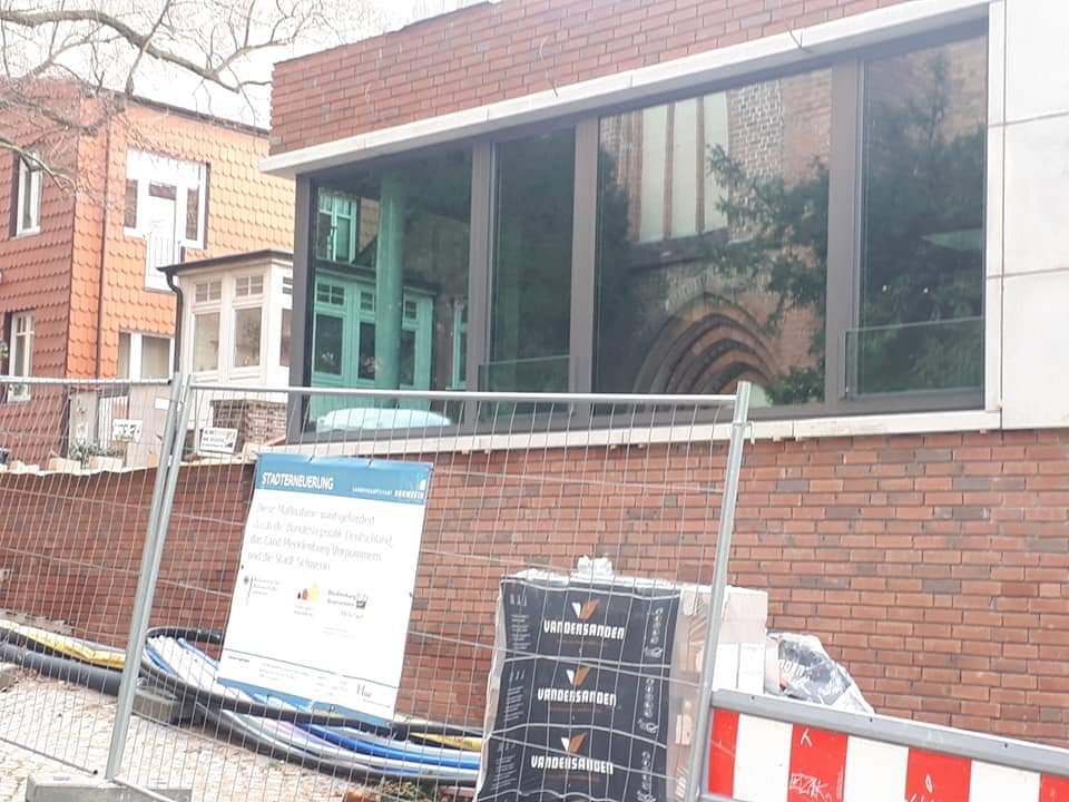 In Abstimmung mit der Landesdenkmalfachbehörde (LAKD) wurde der vorgelegte Bauantrag gemäß DSchG MV § 7(1) in Hinblick auf mögliche zu erwartende erhebliche Beeinträchtigungen für die Substanz und das Erscheinungsbild der umgebenden Denkmale geprüft, ebenso erfolgte die Prüfung in Bezug auf die in der Denkmalbereichsverordnung genannten Schutzgegenstände (§4). Die Denkmalbehörden haben vor dem Hintergrund der funktionstechnischen Notwendigkeit einer Schaltstation (Stromversorgung/Glasfaserknoten) für die Altstadt sowie der vorgelegten Entwurfsplanung im Rahmen der Ermessenausübung festgestellt, dass durch den mittlerweile ausgeführten Baukörper mit seiner Fassaden-/Grundrissgestaltung keine erhebliche Beeinträchtigung zu erwarten steht und damit der Bauantrag nach Denkmalschutzgesetz MV zu genehmigen sei. Die Auffassung, dass die Domfassaden durch die nördliche Fensterfront im 1. OG in ihrer Bedeutung in den Hintergrund gedrängt werden, wird nicht denkmalpflegerisch geteilt. Unterschiedlich große Fensterformate sind an verschiedenen historischen Bestandsgebäuden im Altstadtbereich nachweisbar sowie ein durchaus gängiges und auch für verschiedene Zeitebenen typisches Gestaltungselement in den Fassaden.