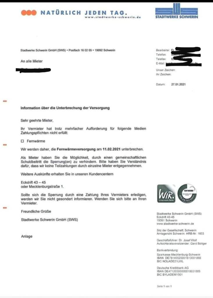 SUPER! Was Druck aus der Öffentlichkeit (Schweriner helfen Schwerinern!) doch alles bewirken kann. In einem kurzen Telefonat bestätigte der Stadtwerke Schwerin Chef Herr Wolf, dass es zu keinen (!) Abschaltungen kommen wird – und dies weder in der Vergangenheit, noch Zukunft passieren wird. Des weiteren gab er bescheid, dass der neue Verwalter bereits einen Großteil der Zahlungen übernommen hat. Den Kunden wird/wurde zudem angeboten die Abschläge zukünftig an die Stadtwerke direkt zu zahlen. Die Mieter werden dazu noch informiert.