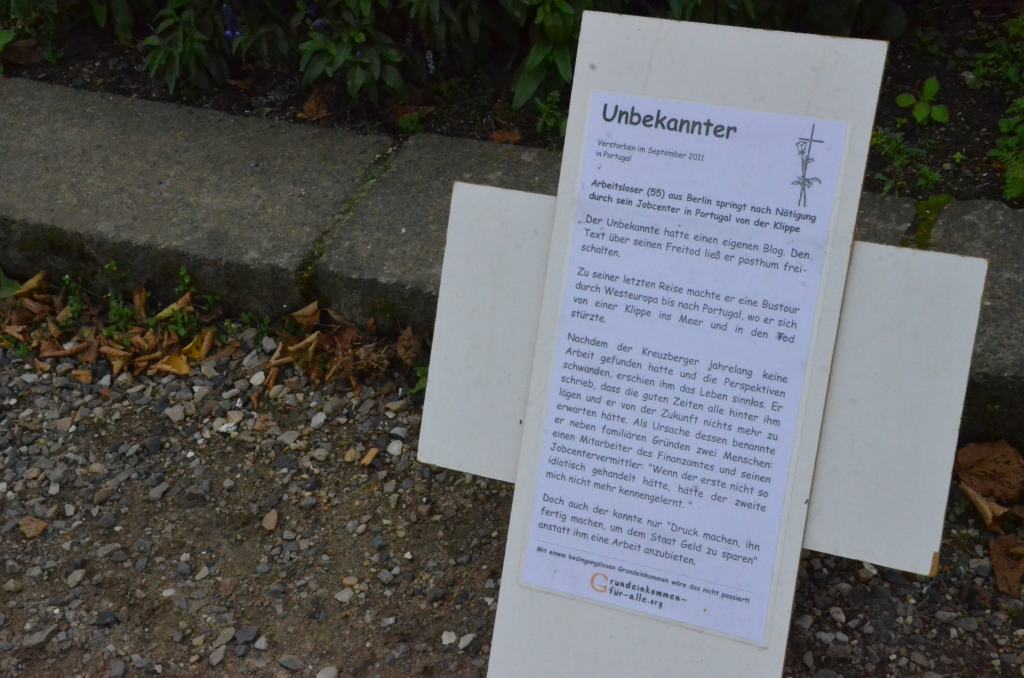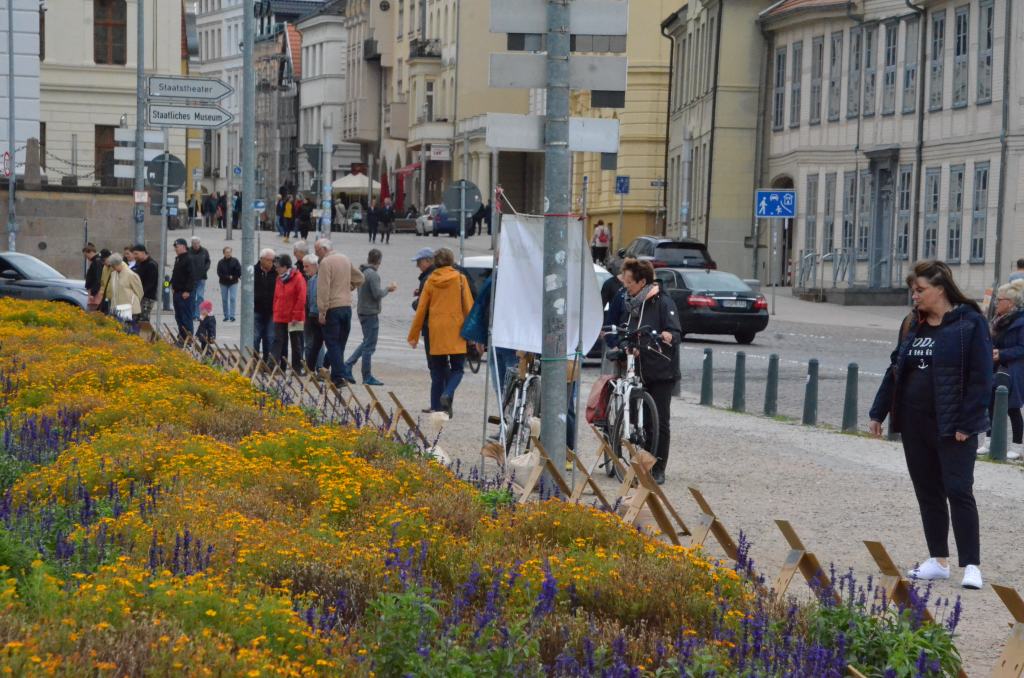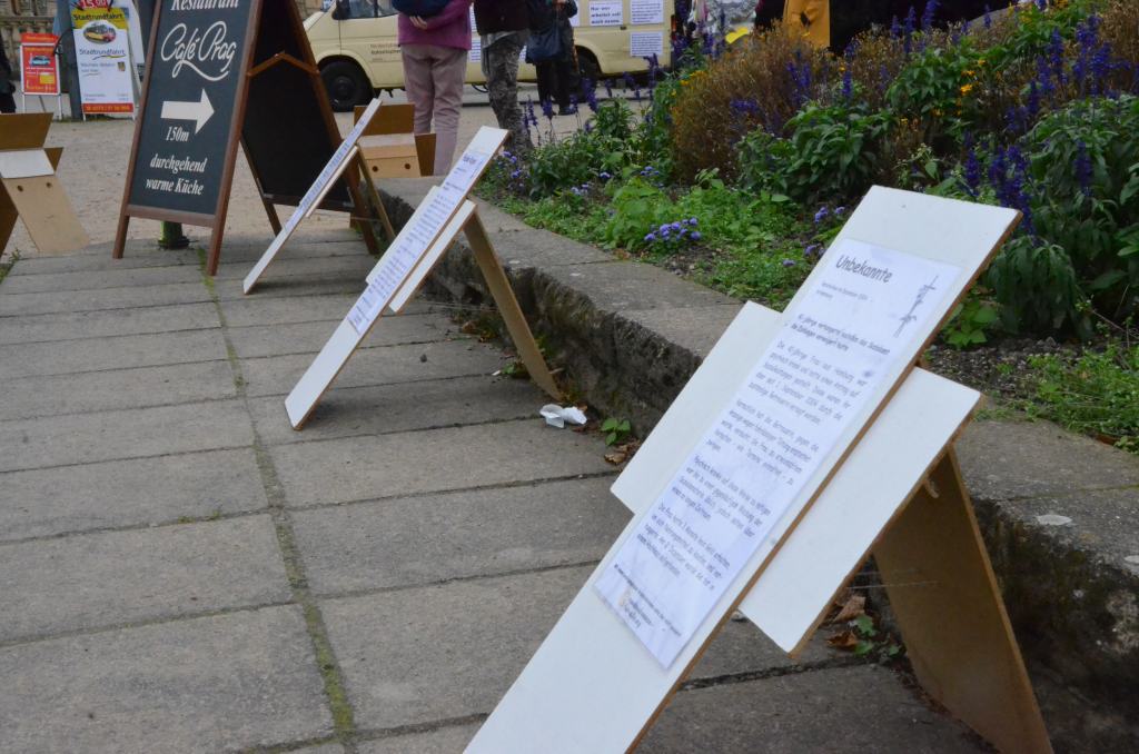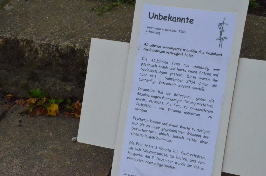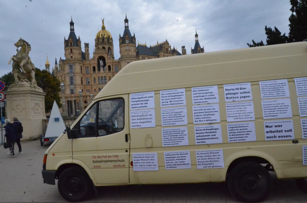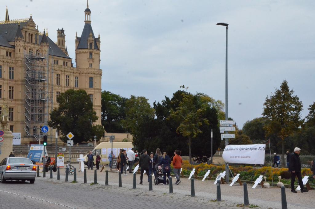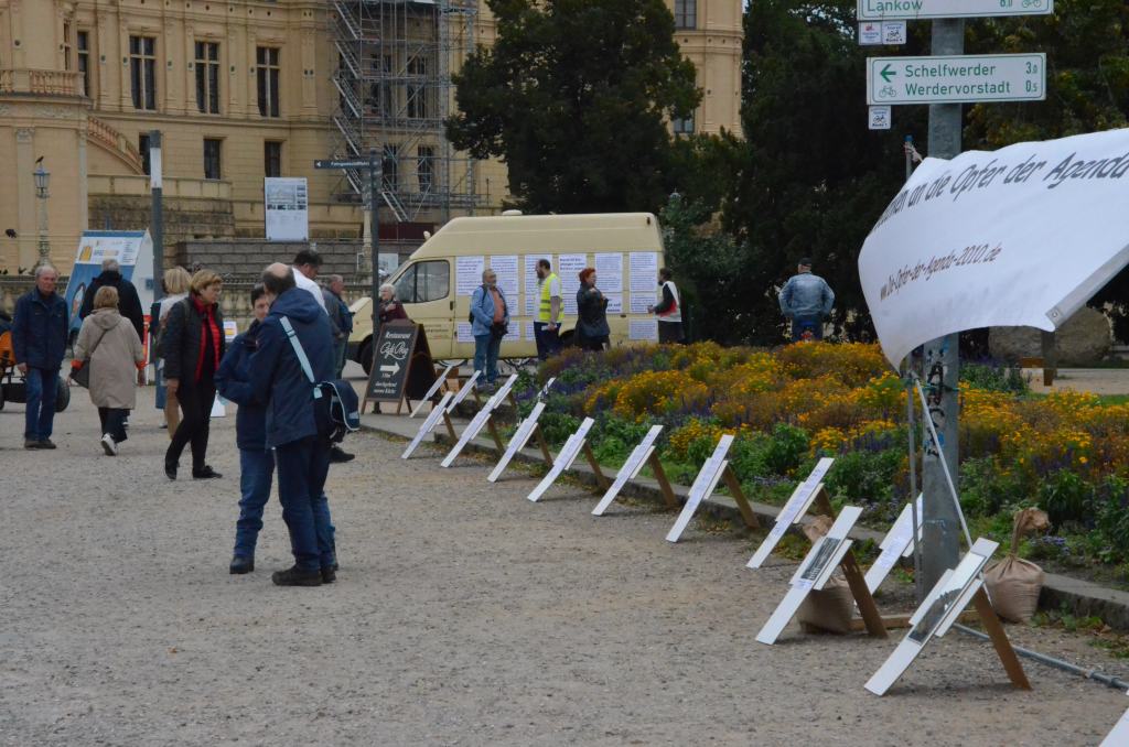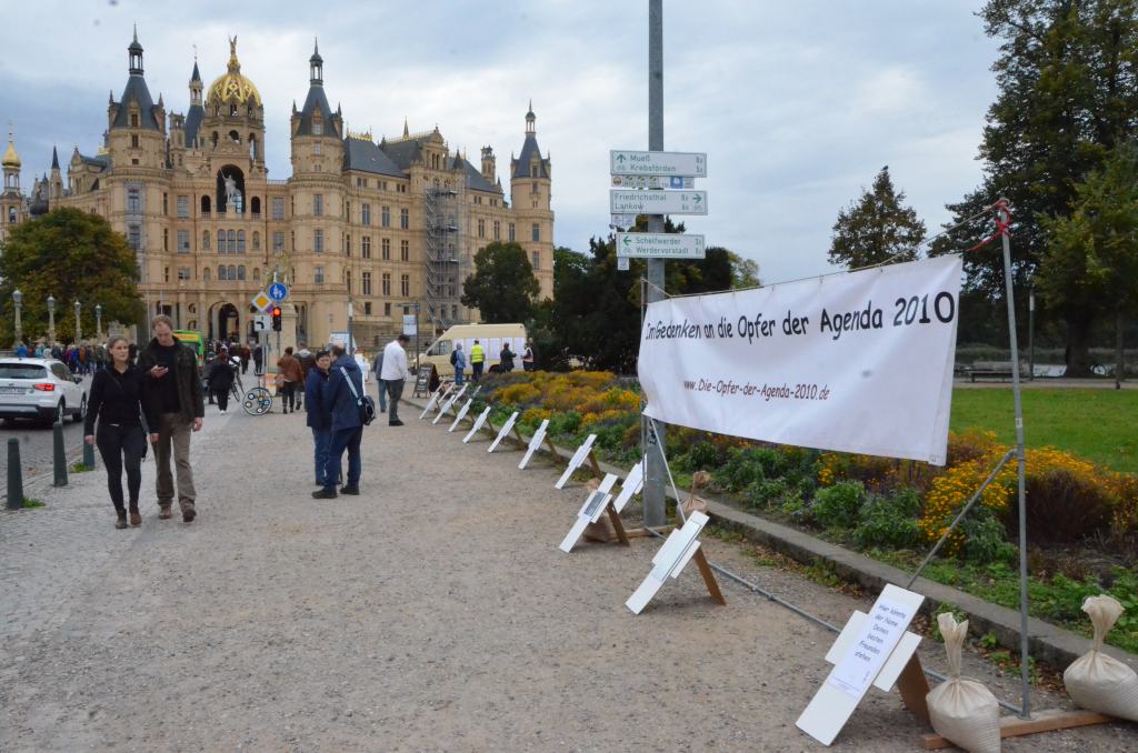 Die Initiatoren und Aktivisten Michael Fielsch und Frigga Wendt aus Berlin machten an diesem Feiertag in der Landeshauptstadt Schwerin Station. Ihre Ausstellung trägt den Namen: „Die Opfer der Agenda 2010“.