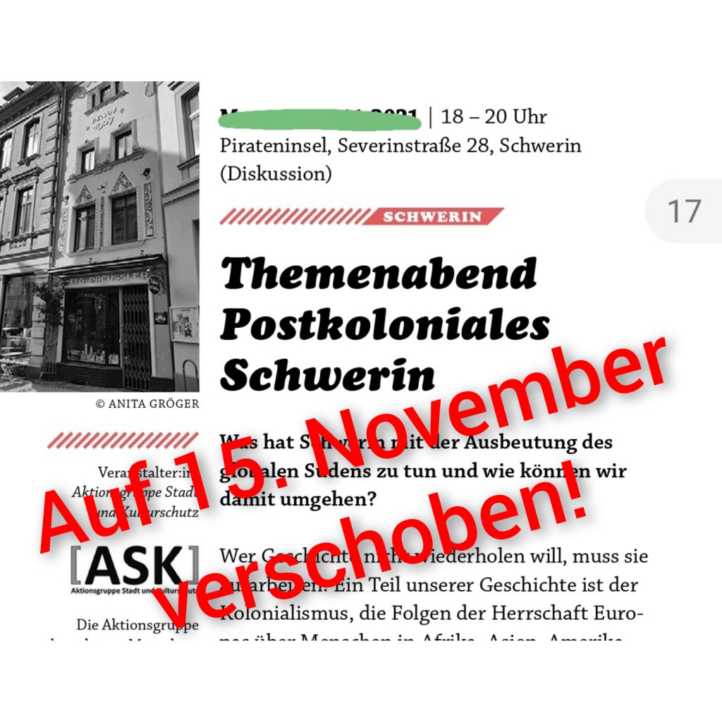 2 Antworten zu „Themenabend zu „Postkolonialismus in Schwerin“ wird auf 15. 11. 2021 verschoben.“