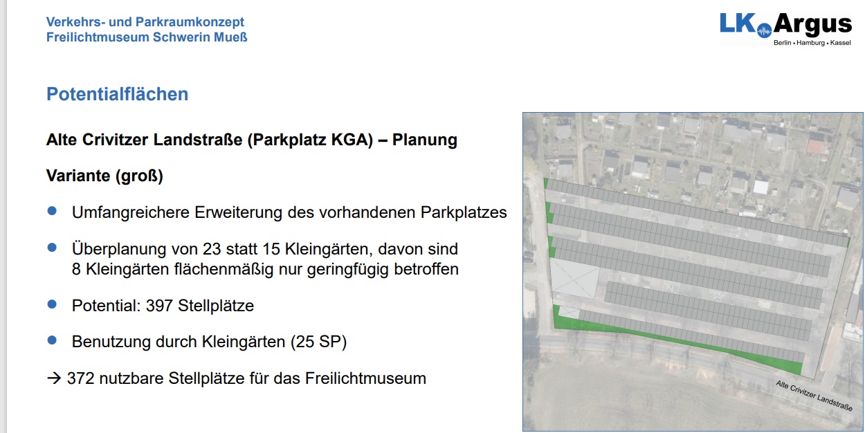 Zum dem Tagesordnungspunkt 4.5 liegt ein Parkraumkonzept vor. Über das sollen die Ausschussmitglieder beraten. Für den angestrebten Außenstandort der BUGA2025 in Rostock, das Freilichtmuseum Mueß, werden laut Planern bis zu 1200 Parkplätze benötigt. Ein Teil davon soll durch Überbauung von bestehenden Kleingärten gesichert werden. 15 bis 23 Gärten sollen dadurch zur Asphaltwüste werden.