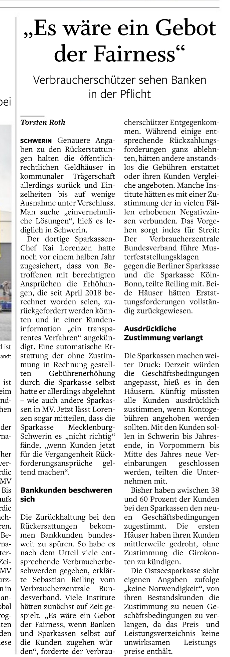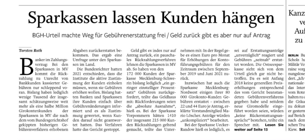 Während die Parteien sich seit Monaten wegducken, hatte die Schweriner Aktionsgruppe Stadt und Kulturschutz frühzeitig auf die kundenunfreundlichen Regelungen der Sparkassen aufmerksam gemacht, dass zu Unrecht erhobene Gebühren nicht automatisch zurückerstattet werden.