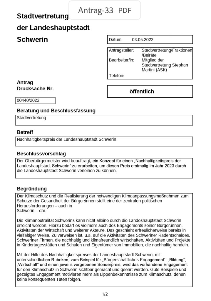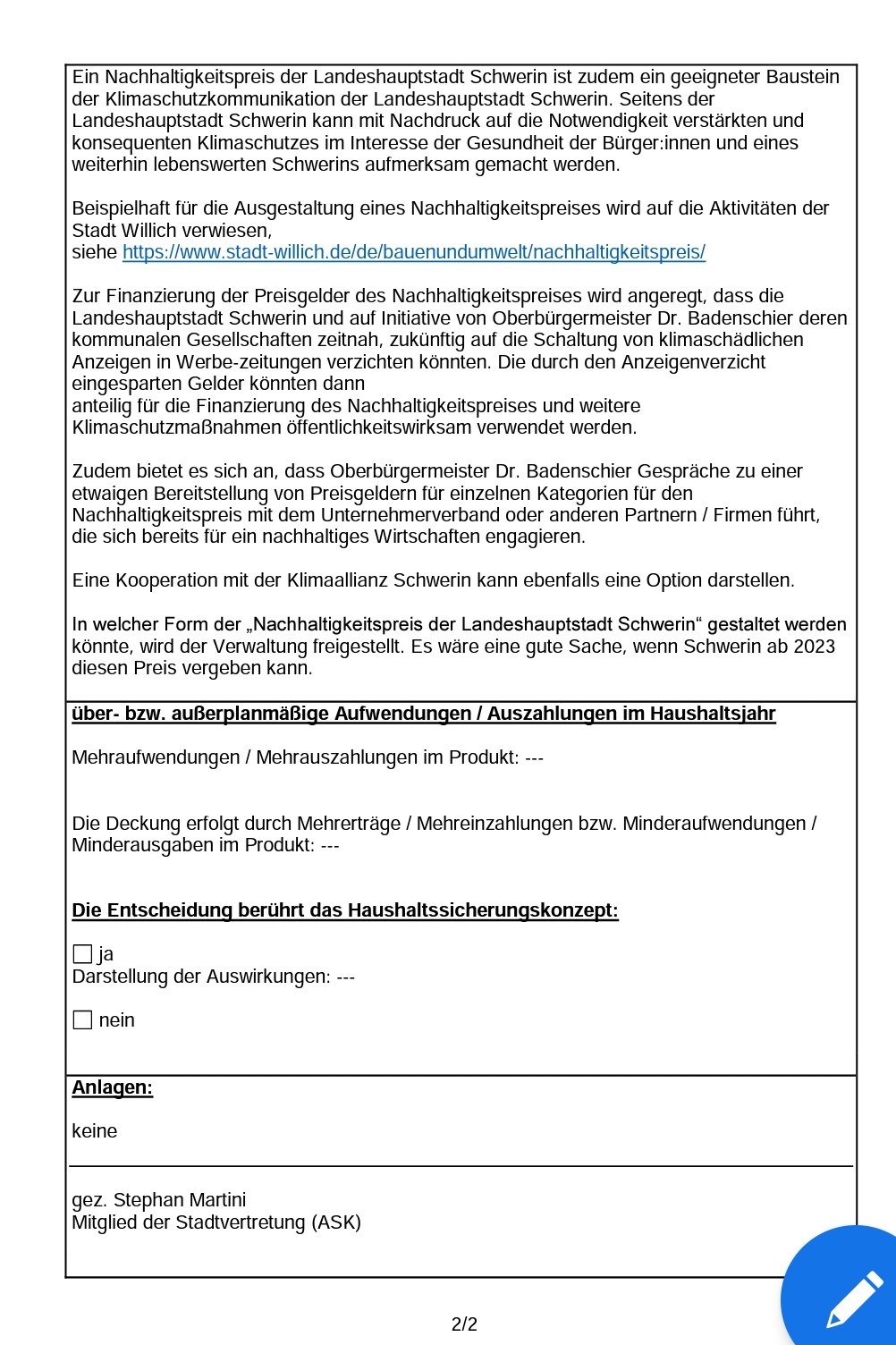 Vielleicht gelingt es uns ja gemeinsam, dass im Jahr 2023, erstmalig ein „Nachhaltigkeitspreis der Landeshauptstadt Schwerin“ vergeben werden kann.