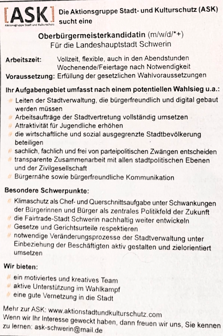 Wir, die ASK Schwerin suchen mit einer Stellenanzeige, die am 27.11. im Blitz erschienen ist nach einer geeigneten Kandidatin/ einem geeigneten Kandidaten für den Oberbürgermeister Wahlkampf.