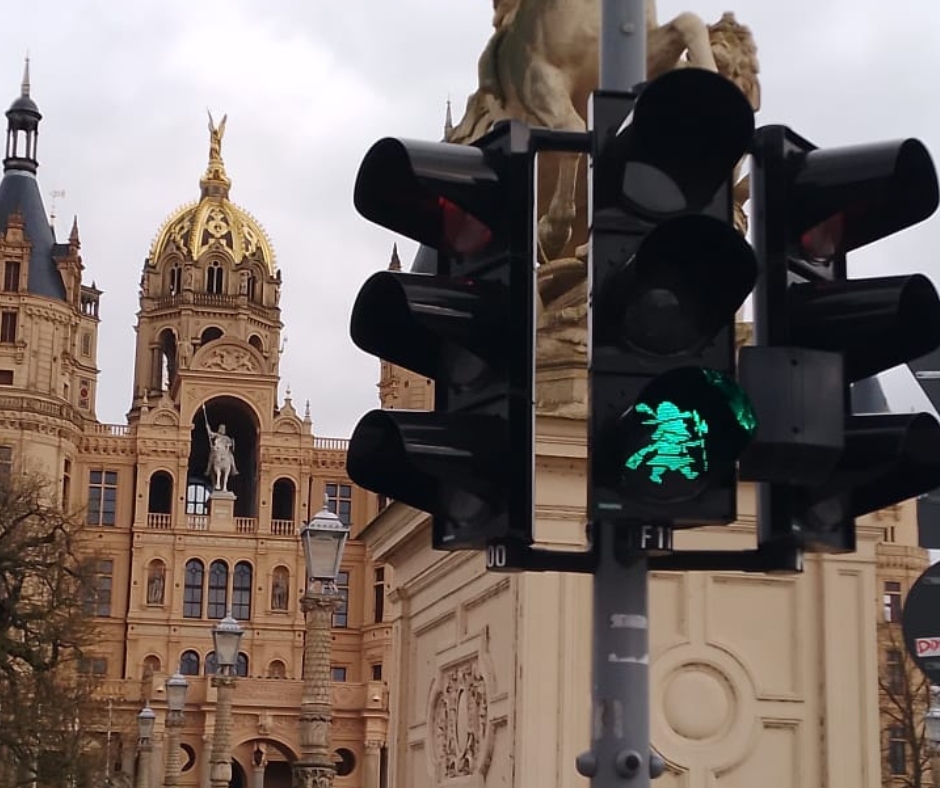 Nun haben wir April 2023. Seit wenigen Tagen findet sich nun doch eine Ampel mit Petermännchen, direkt vor dem Schloss in Schwerin